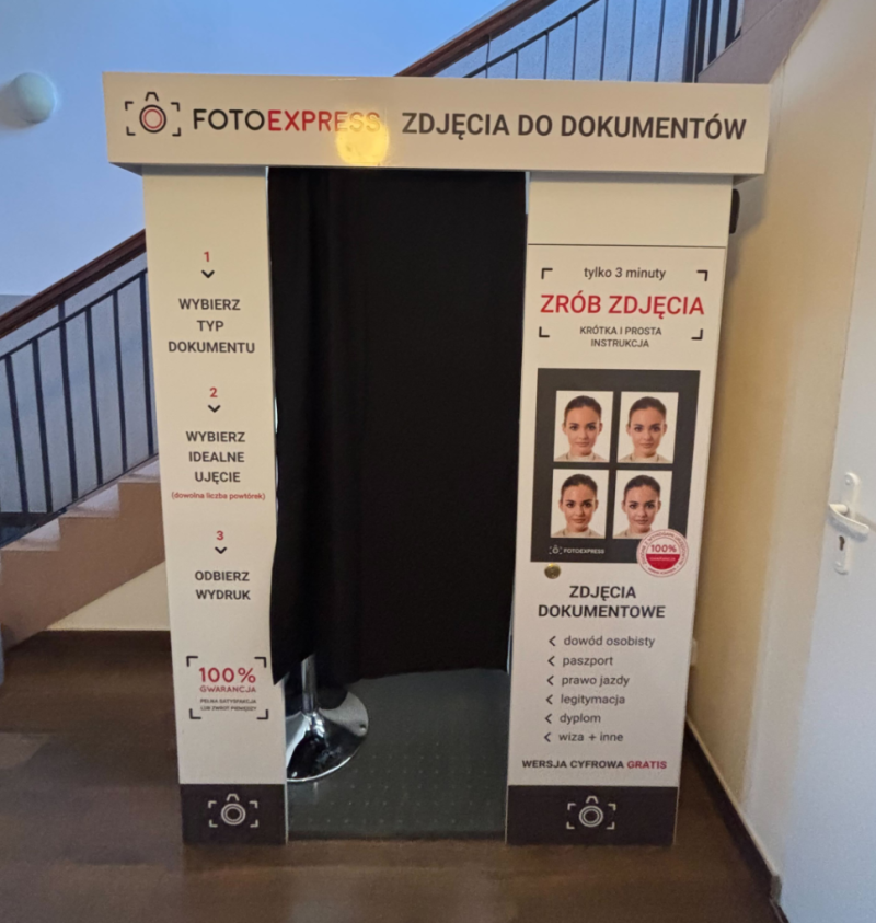 Fotokabina prowadzi użytkownika krok po kroku – wystarczy wybrać rodzaj dokumentu, postępować zgodnie z instrukcjami na ekranie i wykonać zdjęcie. System automatycznie dopasowuje kadr i tło, a gotowe zdjęcia są dostępne po kilku minutach. W cenie mieszkańcy otrzymują także wersję cyfrową – do pobrania na telefon lub e-mail.