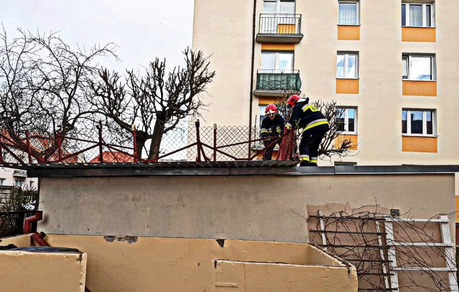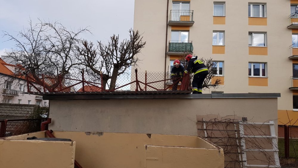 - Zabezpieczyliśmy ten element przed ponownym poderwaniem przez wiatr, powiadomiliśmy też administratora terenu incydencie – mówi Łukasz Wróblewski ze szczycieńskiej straży pożarnej.