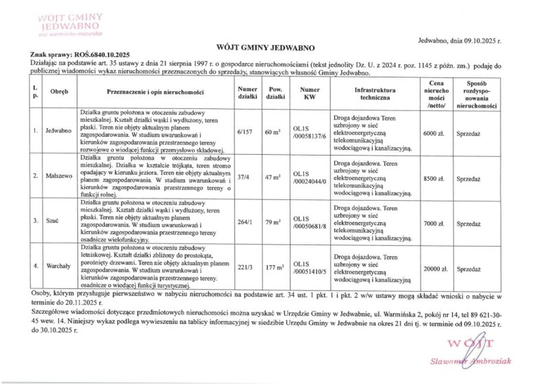 Na stronie Urzędu Gminy w Jedwabnie pojawił się nowy wykaz nieruchomości przeznaczonych do sprzedaży. Samorząd wystawił na sprzedaż cztery działki należące do gminy – w Jedwabnie, Małszewie, Szuce i Warchałach.