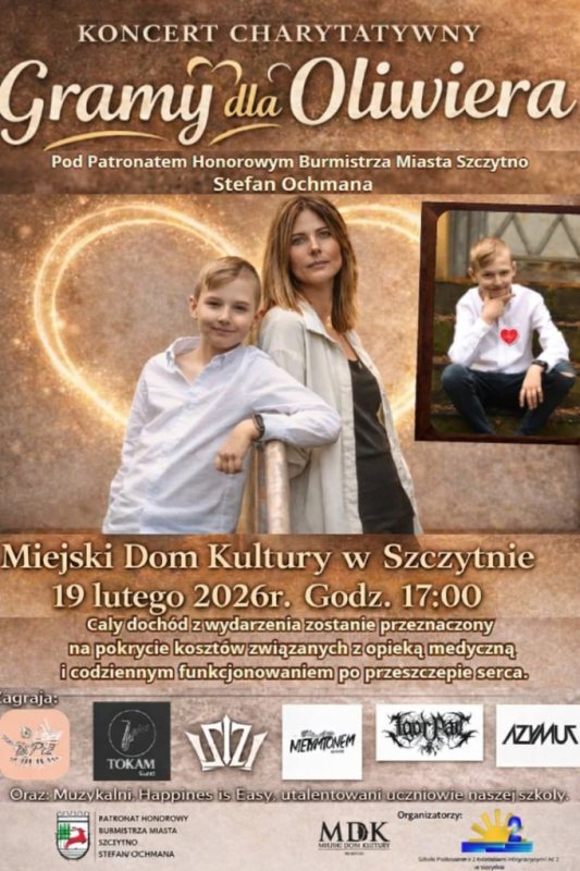 19 lutego o godz. 17.00 w Miejskim Domu Kultury w Szczytnie mieszkańcy spotkają się na koncercie charytatywnym dla Oliwiera. Cały dochód z wydarzenia organizatorzy przeznaczą na pokrycie kosztów leczenia i dalszej opieki medycznej chłopca.