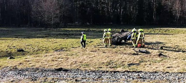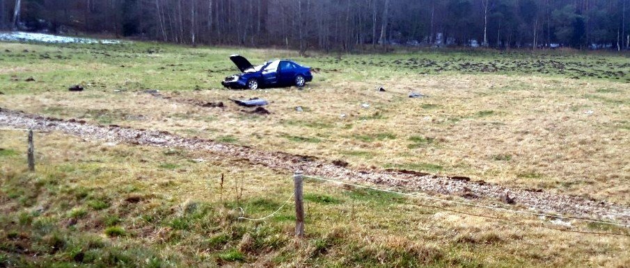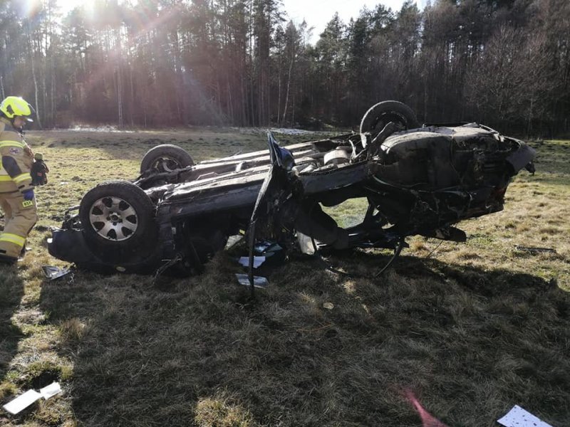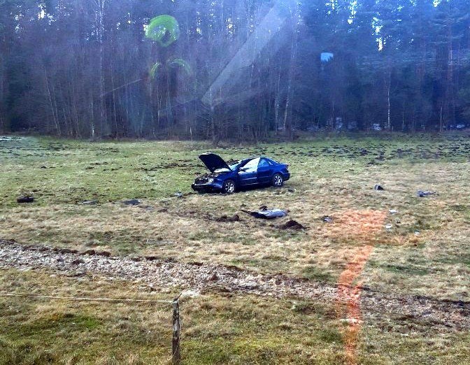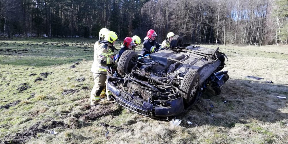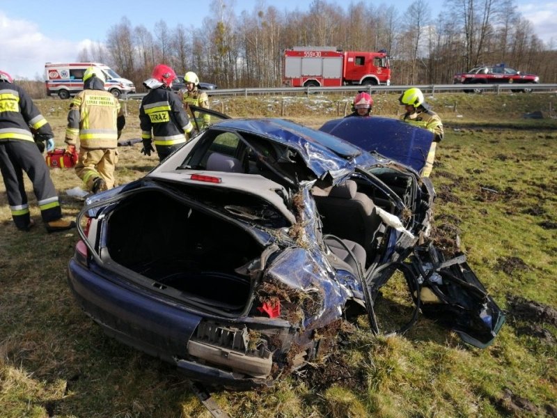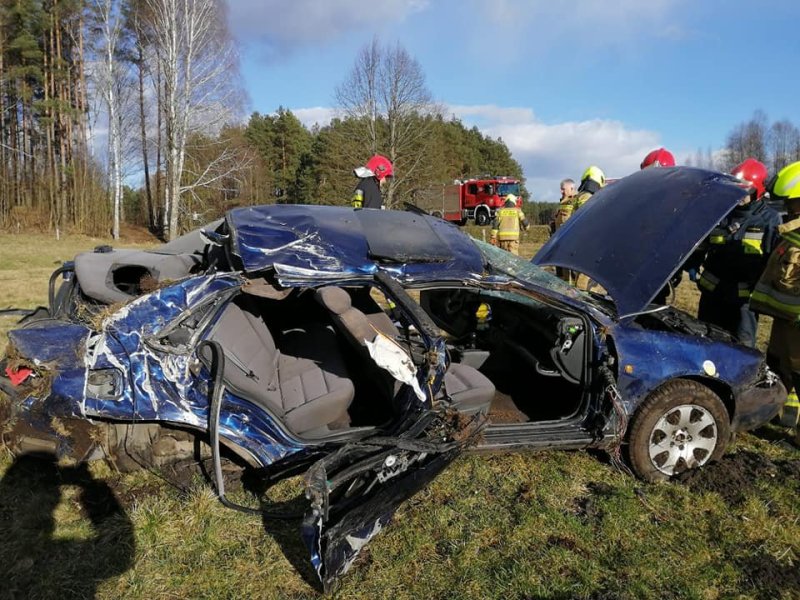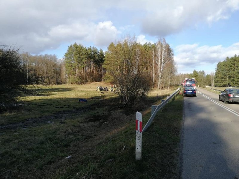 Wypadek wyglądał bardzo groźnie. Auto znalazło się w polu, kilkadziesiąt metrów od drogi. Było solidnie poobijane. Na miejscu kraksy pojawili się ratownicy medyczni oraz strażacy z OSP Jedwabno. To oni udzielili pierwszej pomocy dwóm młodym mężczyznom, którzy jechali samochodem.