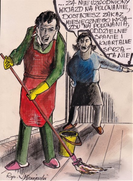 Cyklicznie budziłem się, i trzeźwiałem zlany potem. Skoro świt zerwałem się na drętwe nogi, patrzę i oczom nie wierzę. Z drugiej strony krzaków, przy rozłożystej brzozie, stoi mój samochód, a wewnątrz szczeka, sapie, drapie i chrapie mój wyżeł szorstkowłosy. Dobrze, że mu zostawiłem otwartą szparę w oknie. Na drugi dzień uregulowałem wszystkie należności wobec koła i zabrałem się za wyznaczone roboty dla koła. Jednocześnie sumiennie wykonuję obowiązki wobec żony i dla ogniska domowego. Jednym słowem zmieniłem i to radykalnie swoje postępowania myśliwskie i małżeńskie.