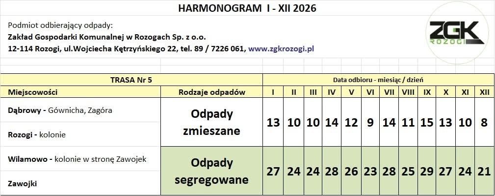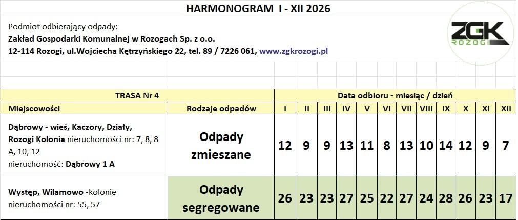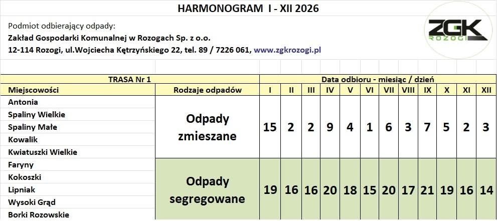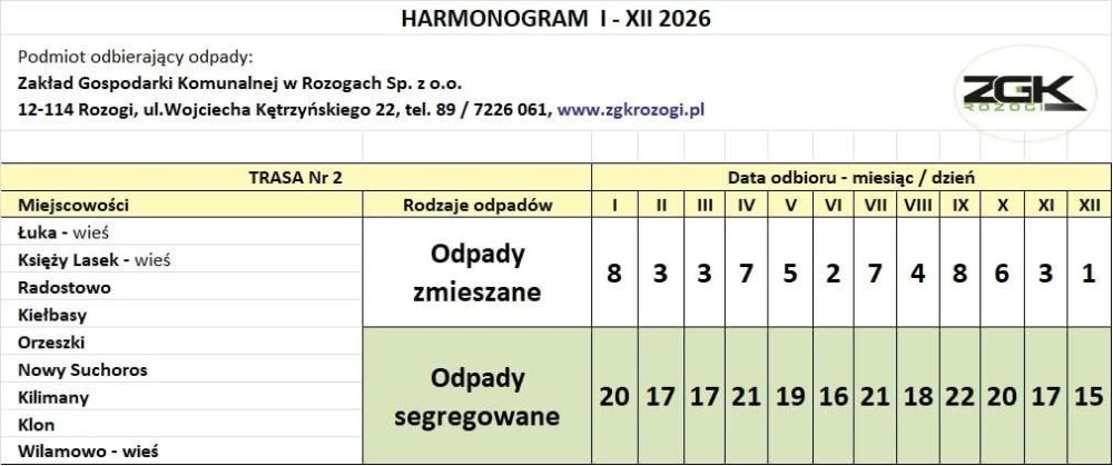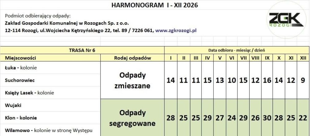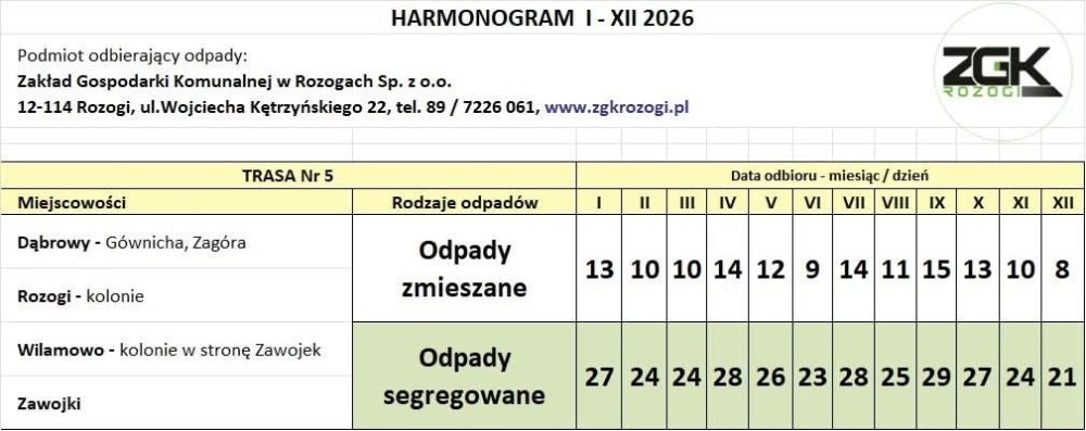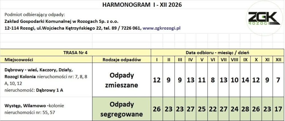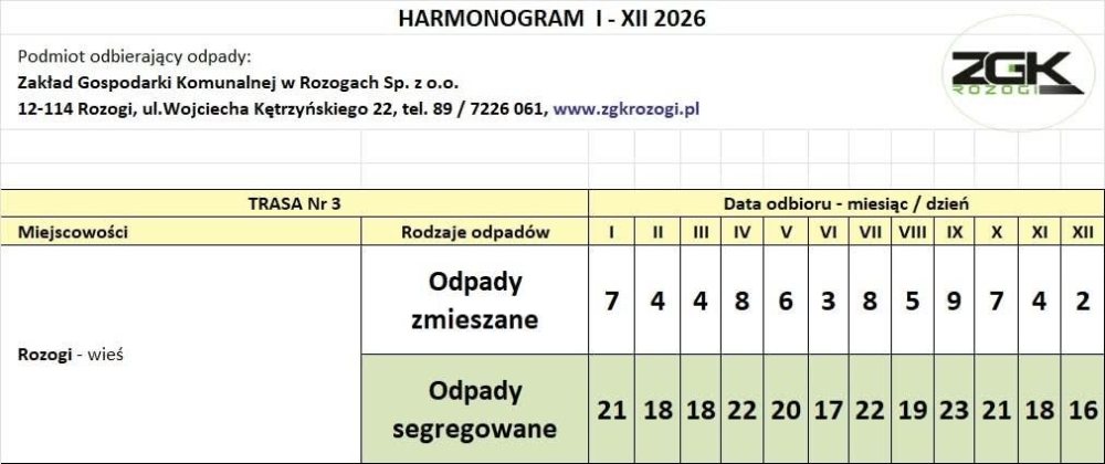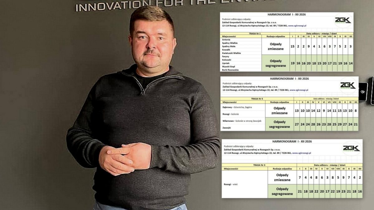 Informację przekazał Karol Włodkowski, prezes Zarządu Zakładu Gospodarki Komunalnej w Rozogach. Jak podkreśla, harmonogram na 2026 rok został przygotowany z wyprzedzeniem, aby mieszkańcy mogli spokojnie zaplanować odbiór odpadów z posesji.