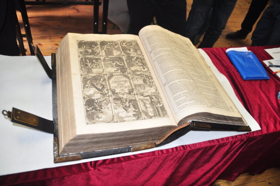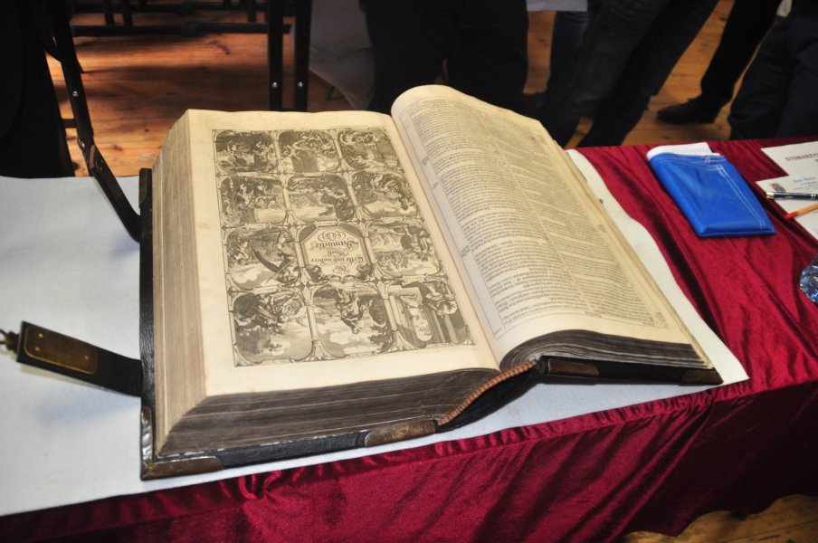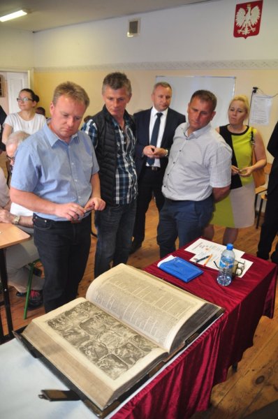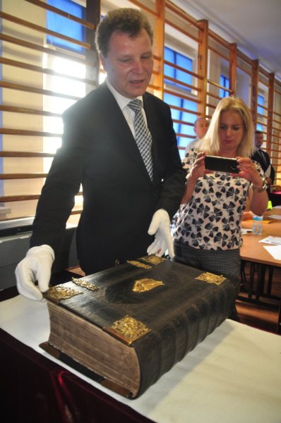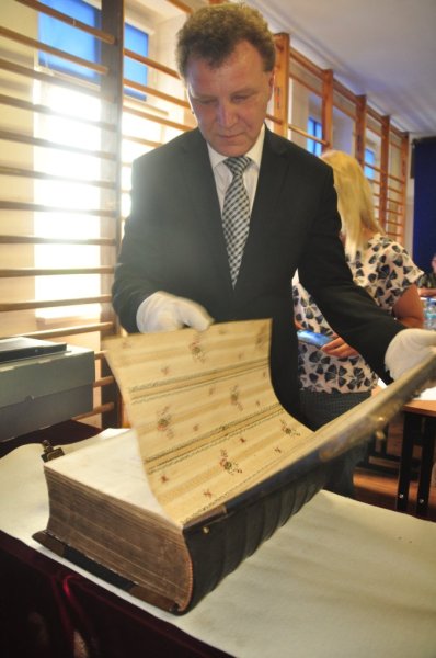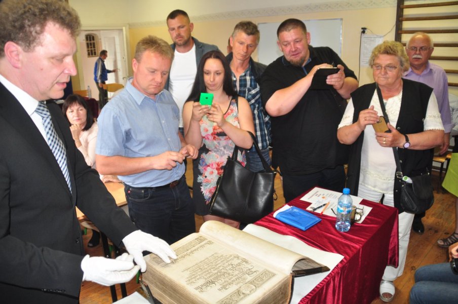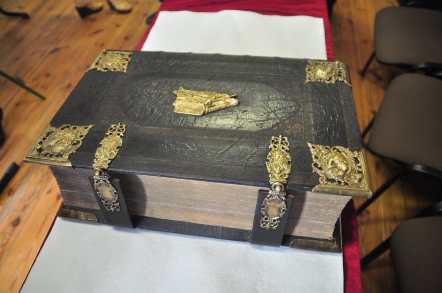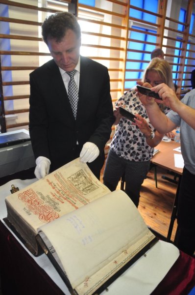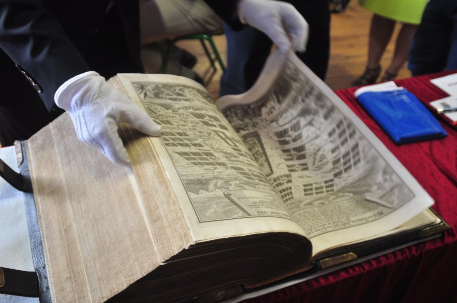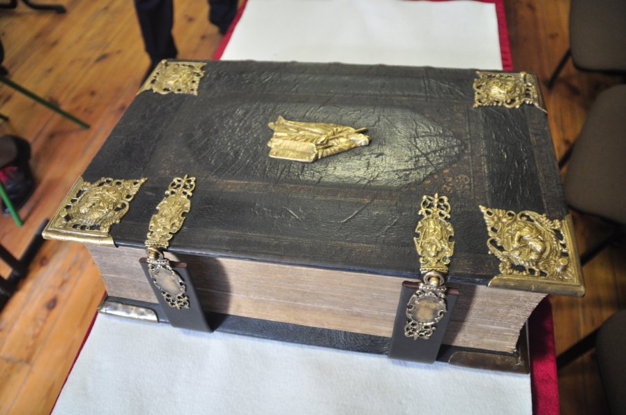Ksiądz Twardzik przyniósł na sesję odrestaurowaną Biblię z 1708 roku. Wydrukowano ją w Norymberdze.