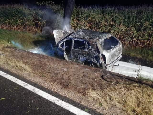 Do dramatycznego wypadku doszło z poniedziałku na wtorek na trasie Rozogi – Występ. Z drogi wypadł hyundai tucson, wjechał do rowu i uderzył w drzewo. Auto niemal natychmiast stanęło w ogniu. Samochodem jechał 69-letni mieszkaniec Ostrołęki oraz jego 40-letnia znajoma.