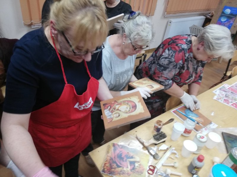 W Gminny Ośrodek Kultury w Wielbarku zorganizował kolejne warsztaty rękodzieła artystycznego dla dorosłych. Podczas czterogodzinnych warsztatów wykonano ikony na desce z wykorzystaniem wydruku na papierze, farb akrylowych, lakieru postarzającego, patyn, technik złocenia.