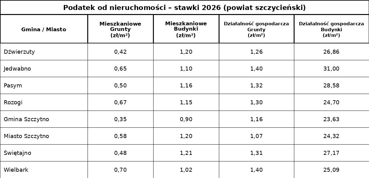 Zwiększane co rok (z nielicznymi wyjątkami) stawki podatków od nieruchomości budzą szereg emocji: coraz rzadziej wśród radnych, niezmiennie u tych, których bezpośrednio dotyczą. Porównajmy, jak te stawki wyglądają w 2026 roku w samorządach powiatu szczycieńskiego.