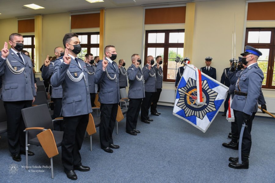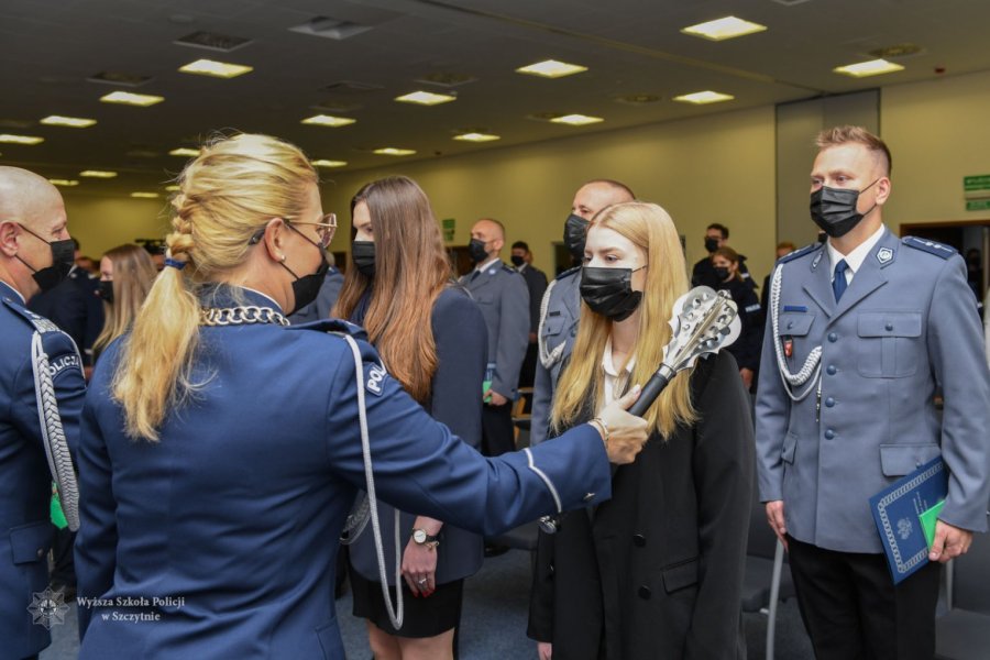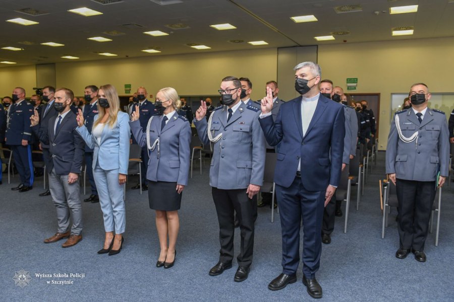 W dalszej części uroczystości Dziekan Wydziału Bezpieczeństwa i Nauk Prawnych, mł. insp. dr Agnieszka Choromańska, odczytała akt przyjęcia studentów w poczet Uczelni. Następnie delegacje studentów cywilnych oraz studentów-funkcjonariuszy złożyły uroczyste ślubowanie oraz odebrały symboliczne indeksy. Tradycyjnie podczas uroczystości wręczono także dyplomy uzyskania stopnia naukowego doktora, które wręczył tym osobom gen. insp. dr Jarosław Szymczyk, Komendant Główny Policji.