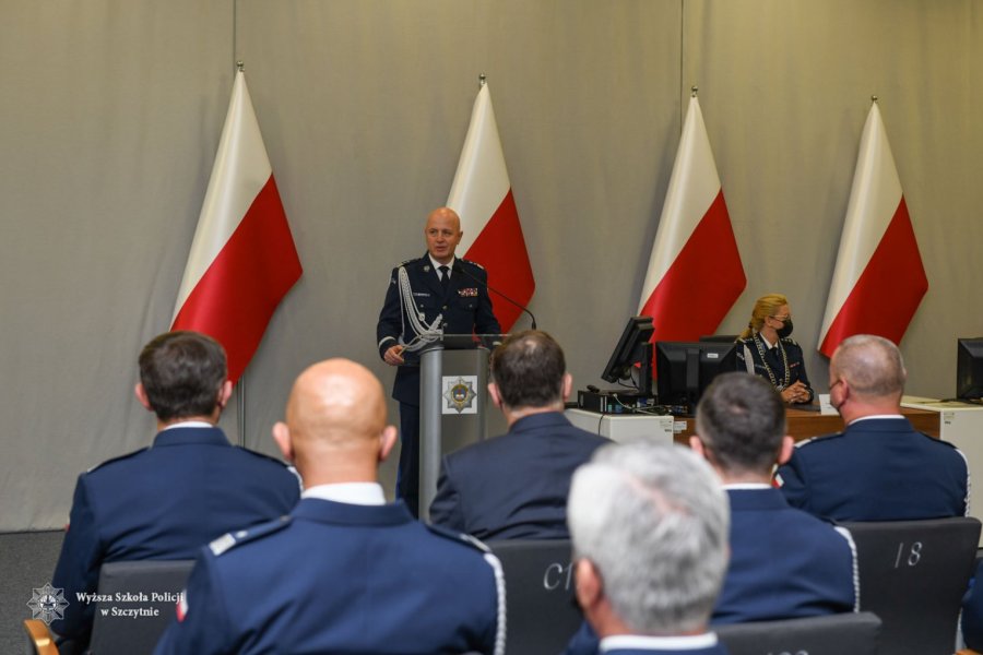 Podczas inauguracji swoje wystąpienie wygłosił także gen. insp. dr Jarosław Szymczyk. Komendant Główny Policji przywitał wszystkich gości i wyraził radość ze spotkania w Wyższej Szkole Policji w Szczytnie po blisko półtorarocznej przerwie, wynikającej z pandemii COVID-19. Komendant Główny Policji w swoim wystąpieniu zwrócił uwagę na rolę Policji na całym świecie w przestrzeganiu i egzekwowaniu ograniczeń, które zostały nałożone na społeczeństwo w związku z pandemią. Komendant Główny Policji wspomniał także o planach dotyczących rozwoju szkolnictwa policyjnego. Na koniec wystąpienia gen. insp. dr Jarosław Szymczyk zwrócił się do obecnej na sali społeczności akademickiej WSPol, dziękując wszystkim za służbę i pracę zaznaczając przy tym, że pandemia nie wpłynęła, na jakość kształcenia w Wyższej Szkole Policji w Szczytnie, z czego wszyscy mogą być dumni.