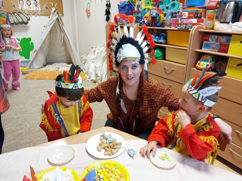 Dzięki opowieściom przy zaimprowizowanym ognisku, przedszkolaki dowiedziały się, jak witali się rdzenni mieszkańcy Ameryki Północnej oraz jak nazywały się namioty, w których mieszkali na co dzień.