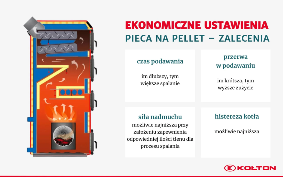 Ekonomiczne ustawienie pieca na pellet wymaga znajomości zasad jego spalania, ale również obserwacji tego procesu, co pozwoli dopasować parametry pracy kotła do własnych potrzeb oraz specyfiki ogrzewanego budynku. Wszelkie zmiany należy wprowadzać jednak stopniowo, a serwisanci Kołton chętnie odpowiedzą na wszystkie pytania dotyczące ekonomicznych ustawień kotła na pellet.