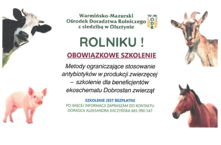 Warmińsko-Mazurski Ośrodek Doradztwa Rolniczego zaprasza rolników z gminy Dźwierzuty na obowiązkowe szkolenie dotyczące ograniczania stosowania antybiotyków w produkcji zwierzęcej. Szkolenie to skierowane jest do beneficjentów ekoschematu „Dobrostan zwierząt” i ma na celu promowanie metod, które poprawiają jakość hodowli, jednocześnie dbając o zdrowie zwierząt.
