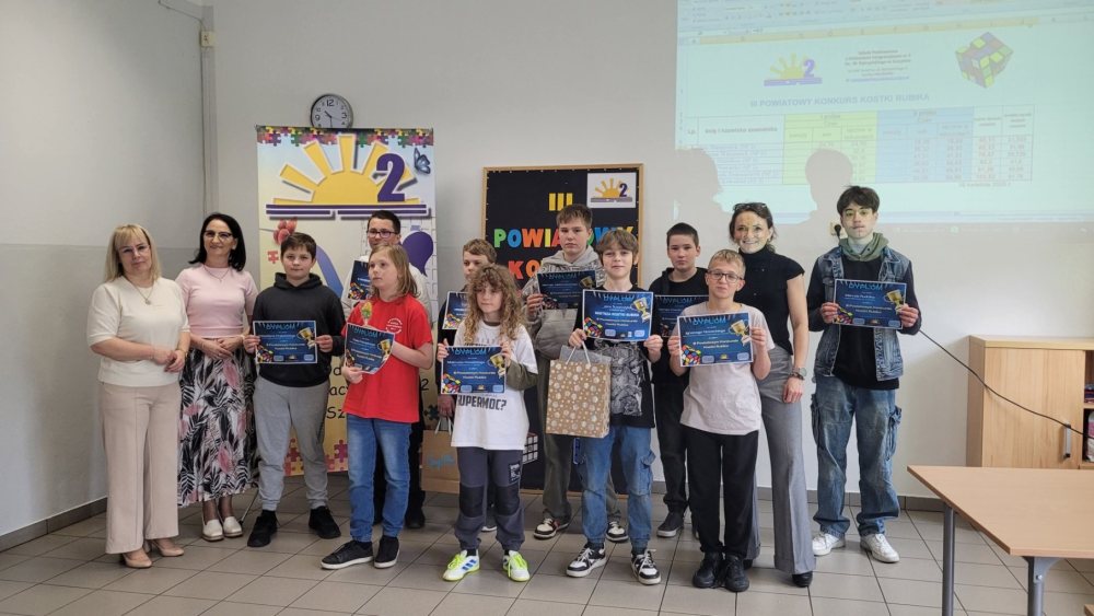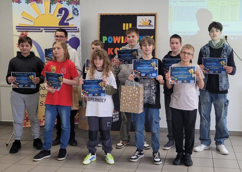 Jan Ślusarczyk z SPzOI nr 2 w Szczytnie został bezkonkurencyjnym zwycięzcą III Powiatowego Konkursu Kostki Rubika, ustanawiając nowy rekord – 18,35 sekundy! Tuż za nim uplasowali się Szymon Wieczorek i Julian Nieróbca ze Szkoły Podstawowej nr 6.