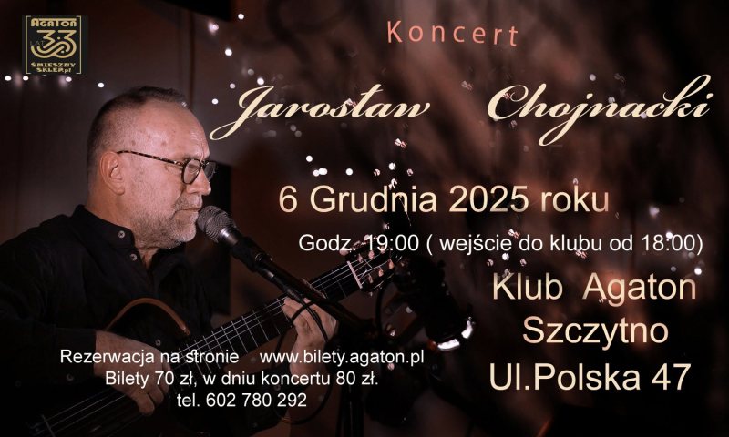 Jarosław Chojnacki, pieśniarz i kompozytor związany ze Szczytnem wystąpi 6 grudnia w Klubie Muzycznym Agaton. Koncert rozpocznie się o godz. 19.00, a liczba miejsc jest ograniczona.