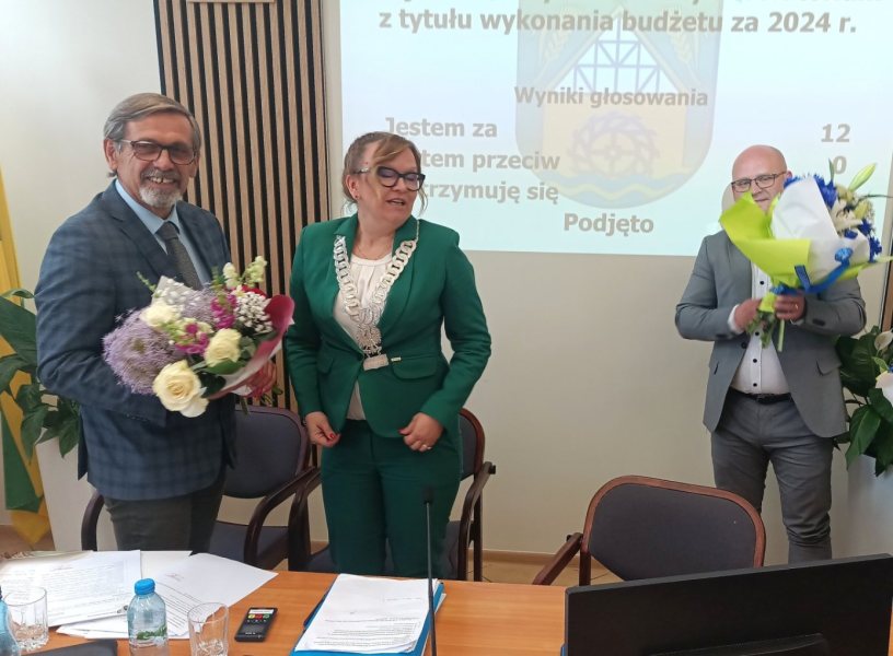W głosowaniach nad wotum zaufania i udzieleniu absolutorium wójtowi Dariuszowi Tymińskiemu radni byli jednogłośnie za (12 obecnych z 15 radnych), co poparte zostało gratulacjami i kwiatami.
