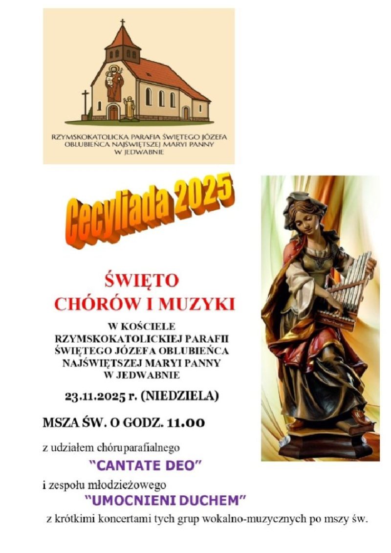 Parafia zaprasza mieszkańców na wspólne śpiewanie i krótkie koncerty po liturgii. Wystąpi chór „Cantate Deo” oraz młodzieżowy zespół „Umocnieni Duchem”. Obie grupy zaprezentują utwory przygotowane specjalnie na Cecyliadę.