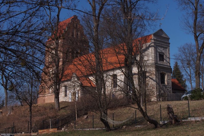 Kościół jest orientowany, salowy, murowany z cegły i kamienia polnego, otynkowany. Wzniesiono go na planie prostokąta. Bryła łączy formy późnogotyckie z elementami baroku. Od wschodu uwagę zwraca wolutowy szczyt. Od zachodu do nawy przylega masywna, czworokątna wieża wzmocniona przyporami. Wieża ma trzy kondygnacje. W dolnej mieści się kruchta z uskokowym portalem, wyższe kondygnacje zdobią ostrołukowe blendy.