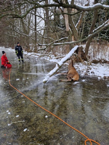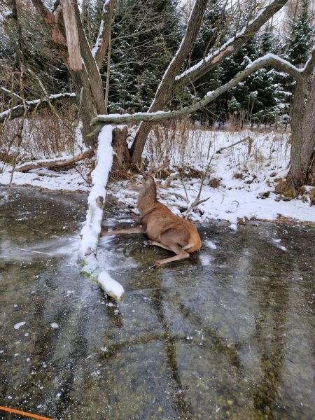 Na jeziorze Kalwa w okolicach wsi Miłuki lód załamał się pod ciężarem jelenia. Zwierzę wpadło do wody i nie było w stanie samodzielnie się wydostać. Na ratunek ruszyli mu strażacy z OSP Pasym.