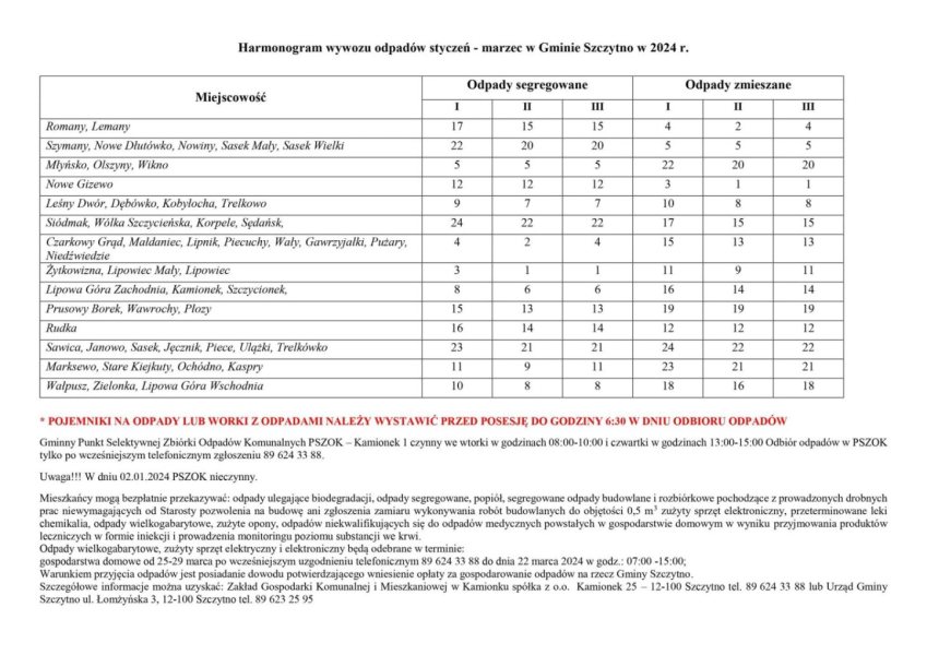 Gmina Szczytno opublikowała waśnie harmonogram odbioru odpadów komunalnych. Na razie opracowany jest on od stycznia do marca 2024 roku. Warto zapoznać się z tym planem.