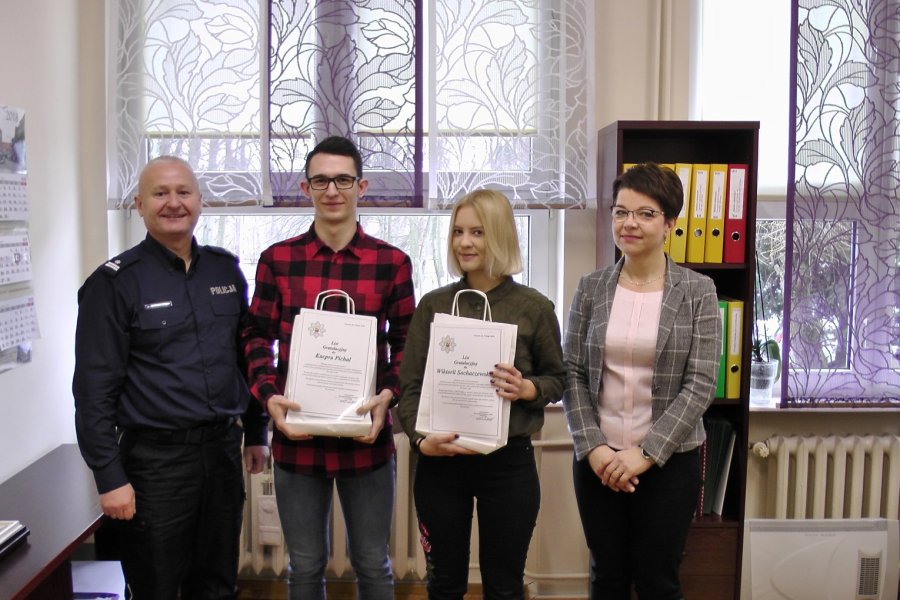 Za taką właśnie reakcję podinsp. Arkadiusz Napiórkowski p.o. I Zastępca Komendanta Powiatowego Policji w Szczytnie, podziękował dzisiaj Wiktorii Sochaczewskiej i Kacprowi Pichal. W gabinecie Marioli Jaworskiej, Dyrektor Zespołu Szkół nr 3 w Szczytnie, odbyło się uroczyste wręczenie listów gratulacyjnych.