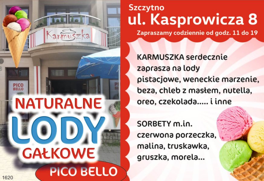 Promocja. Restauracja KARMUSZKA w Szczytnie (ul. Kasprowicz 8) serdecznie zaprasza na NATURALNE LODY GAŁKOWE PICO BELLO - pistacjowe, weneckie marzenie, beza, chleb z masłem, nutella, oreo, czekolada..... i inne.