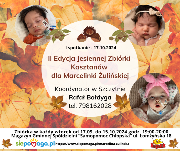 – Jesień to nie tylko czas pięknych kolorów, ale też okazja, by zrobić coś dobrego – mówi Rafał Bałdyga. – Zapraszam mieszkańców Szczytna i powiatu do udziału w zbiórce kasztanów. Wszystkie zebrane środki przeznaczymy na leczenie Marcelinki, która jest mi bardzo bliska – dodaje.