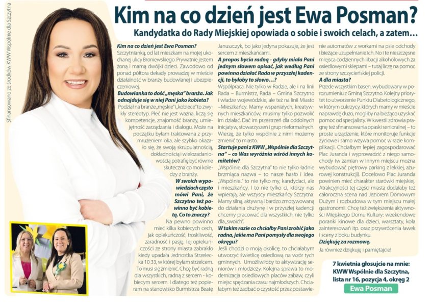 Materiał Wyborczy. Kim na co dzień jest Ewa Posman? Szczytnianką, od lat mieszkam na mojej ukochanej ulicy Broniewskiego. Prywatnie jestem żoną i mamą dwójki dzieci. Zawodowo od ponad półtorej dekady prowadzę w mieście działalność w branży budowlanej i ubezpieczeniowej.