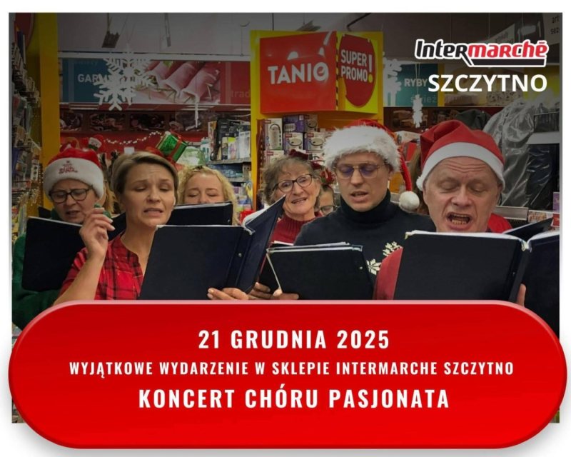 Zakupy i muzyka spotkają się w jednym miejscu. W niedzielę, 21 grudnia, klienci Intermarché Szczytno przy ul. Wileńskiej 3 trafią na koncert kolęd w wykonaniu Chóru Pasionata. Występ odbędzie się w godzinach południowych – dokładna pora pozostaje niespodzianką.