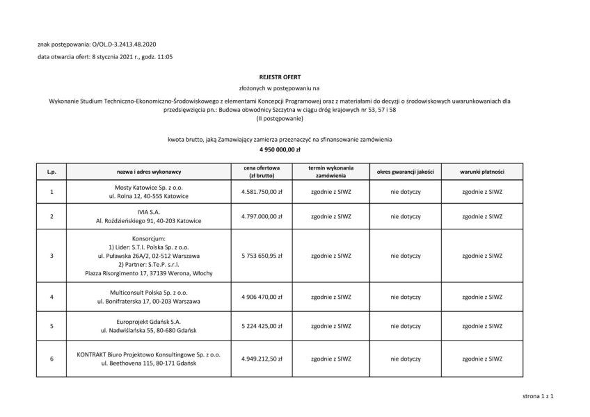 Oprócz ceny, weryfikacji podlegać będą kwalifikacje oraz doświadczenie osób skierowanych do realizacji zamówienia. Komisja przetargowa rozpoczęła analizę i ocenę złożonych ofert. Umowę z wykonawcą planujemy podpisać w drugim kwartale 2021 roku. Usługa ma zostać zrealizowana w terminie 37 miesięcy.