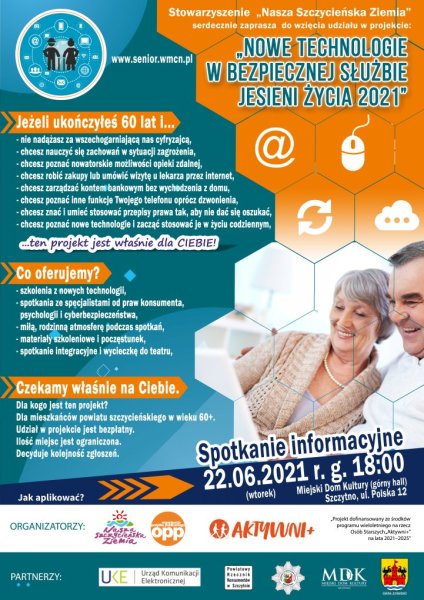 Projekt pt. „Nowe technologie w bezpiecznej służbie jesieni życia 2021” to kontynuacja inicjatywy z roku poprzedniego. Jest on skierowany do osób w wieku 60+ z powiatu szczycieńskiego i zakłada m. in. organizację bezpłatnych zajęć edukacyjnych poświęconych szeroko pojętemu bezpieczeństwu seniorów. Projekt realizowany jest przez Stowarzyszenie Nasza Szczycieńska Ziemia Pawła Krassowskiego. Właśnie zaczyna się rekrutacja. Szczegóły można poznać dzwoniąc pod numer 793-231-737 lub przychodząc na spotkanie informacyjne.