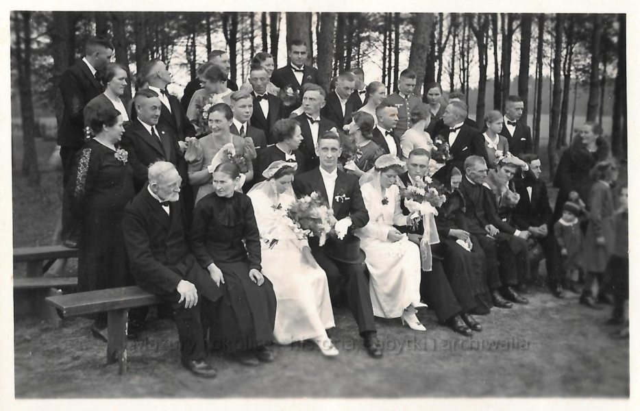 Bardzo lubię ślubne fotografie. Ukazują one, jak zmieniała się moda, ponieważ wszyscy uczestnicy tych uroczystości starali się ubrać jak najlepiej. Przeździęk Mały to położona na uboczu wieś, która interesowała etnografów jeszcze po II wojnie światowej. Można było tam spotkać ciekawe przykłady drewnianego budownictwa. Niewykluczone, że część widocznych na tym zdjęciu osób mieszkała w drewnianej, krytej strzechą chacie.