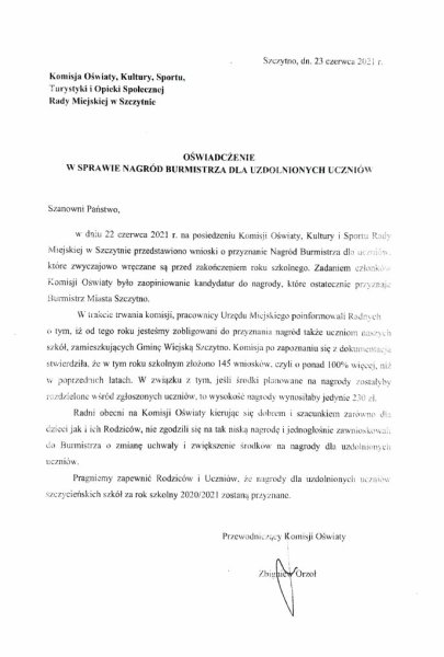 Oświadczenie Komisja oświaty Rady Miejskiej w Szczytnie.