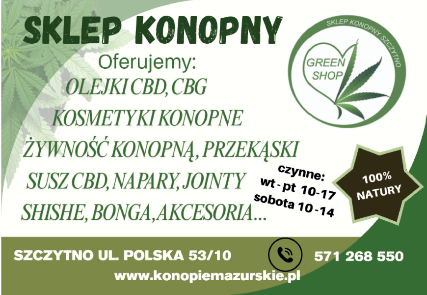 Sklep Konopny w Szczytnie działa od wtorku do piątku w godzinach 10:00–17:00 oraz w soboty od 10:00 do 14:00, można też odwiedzić stronę sklepu na której znajduje się aktualna oferta www.konopiemazurskie.pl – To miejsce dla wszystkich, którzy chcą spróbować czegoś nowego, zadbać o zdrowie w naturalny sposób albo po prostu dowiedzieć się, co kryje się za modnym hasłem „CBD” – mówi Magdalena.