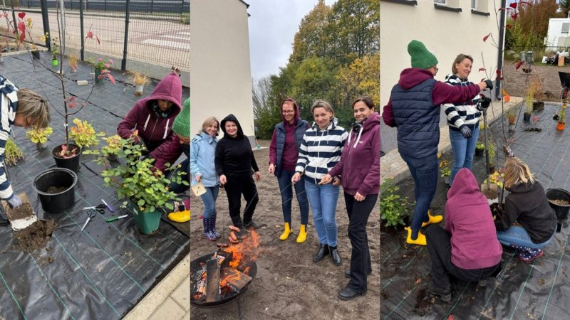 W jesienny poranek wyszły przed budynek i zabrały się za porządki. Wyrównały teren, posadziły rośliny, rozłożyły korę, a potem wspólnie dopieściły każdy szczegół przy bibliotecznym ogrodzie.