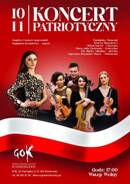 Gminny Ośrodek Kultury w Dźwierzutach zaprasza na koncert patriotyczny, który odbędzie się 10 listopada o godzinie 17:00 w sali widowiskowej GOK.