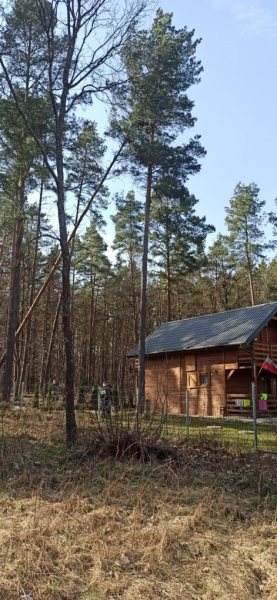 W Siedliskach drzewo przewróciło się na inne drzewo, które z kolei niebezpiecznie zawisło nad domkiem letniskowym.