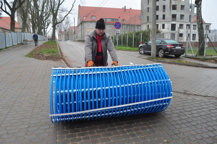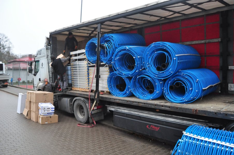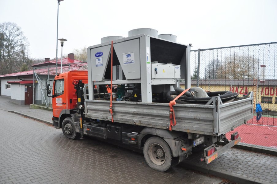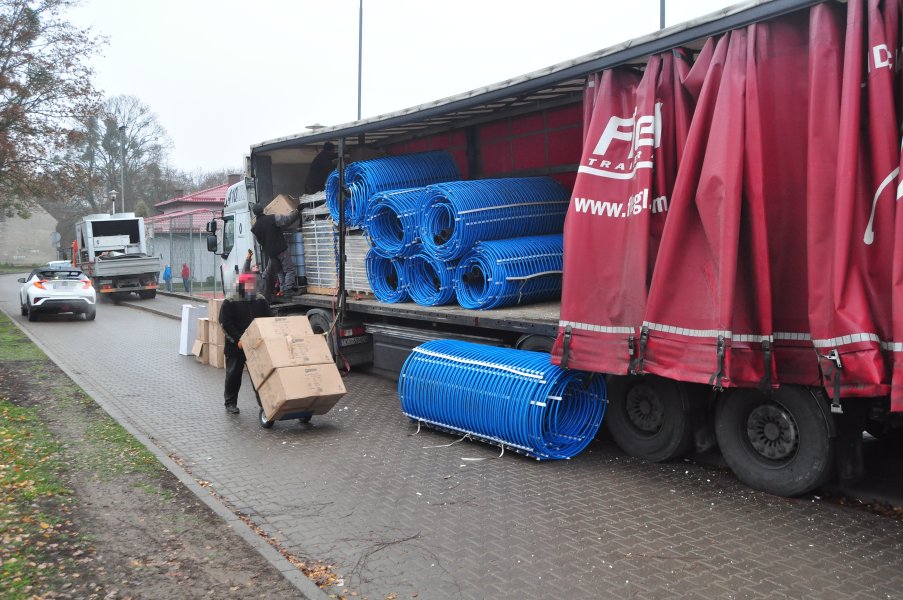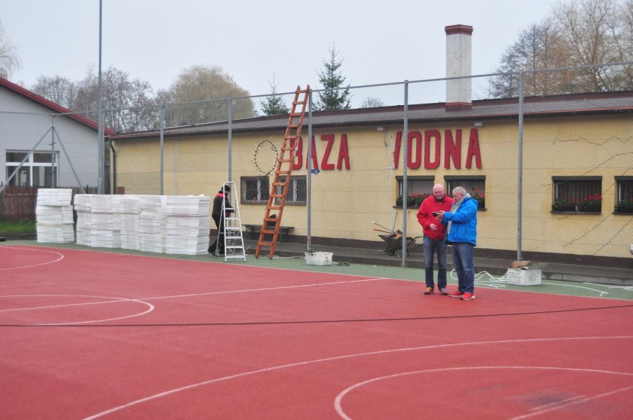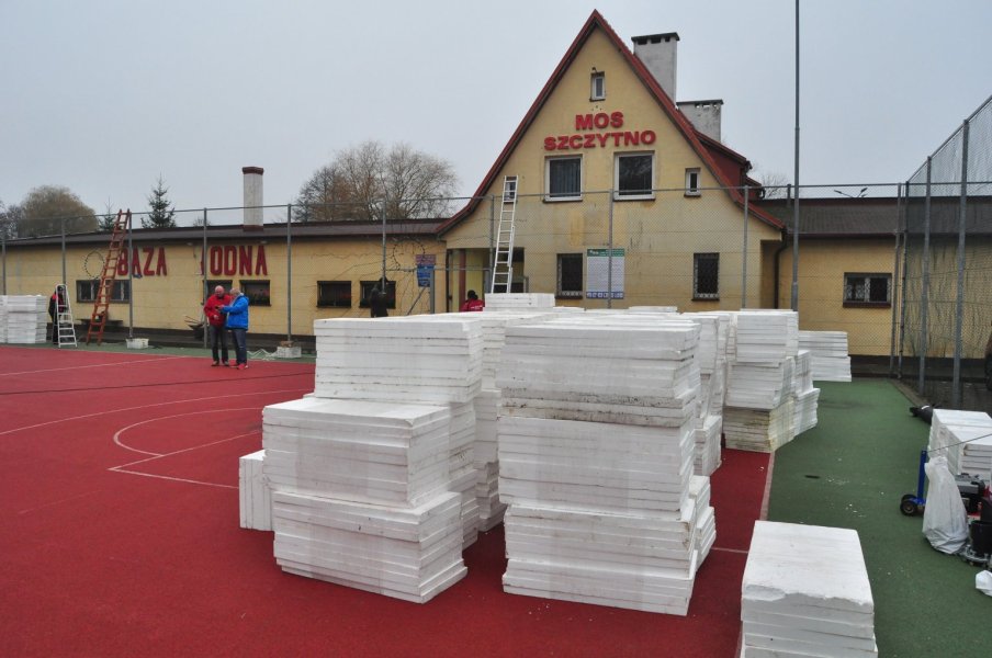 Na dwóch samochodach ciężarowych przyjechało do Szczytna sztuczne lodowisko. Właśnie trwa jego wyładowywanie i układanie na płycie boiska do koszykówki przy ulicy Spacerowej.