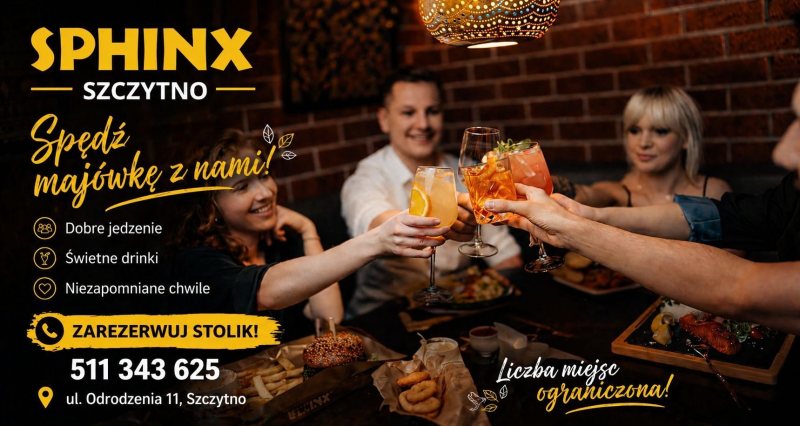 Sphinx w Szczytnie to doskonały wybór zarówno na rodzinny obiad, spotkanie ze znajomymi, jak i wieczorne wyjście przy drinku. Warto jednak pamiętać, że w majówkowy weekend zainteresowanie jest duże, dlatego restauracja zachęca do wcześniejszej rezerwacji stolików.