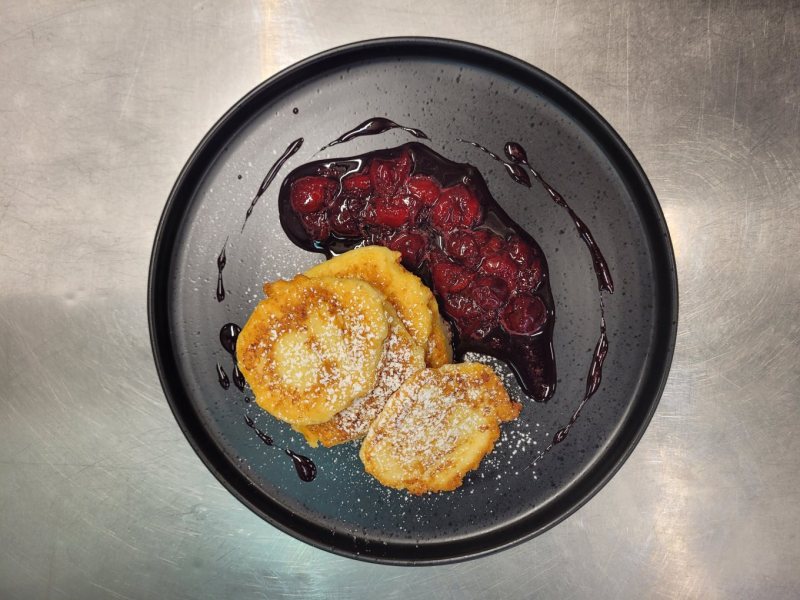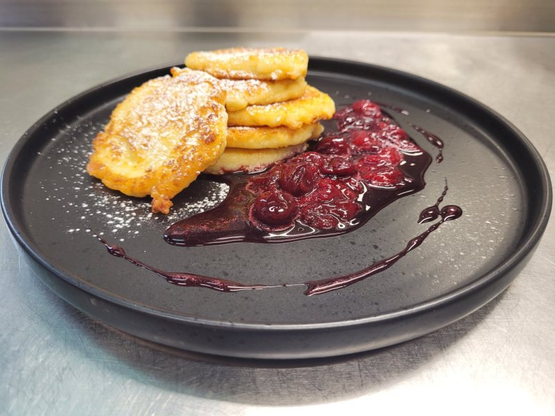 Zemleć ser lub rozetrzeć widelcem. Połączyć z pozostałymi składnikami i wymieszać na puszystą jednolitą masę. Kłaść ciasto łyżką na rozgrzaną patelnię z tłuszczem. Smażyć na rumiano z obydwu stron w średniej ilości tłuszczu. Po usmażeniu odsączyć na papierowym ręczniku. Podawać posypane cukrem pudrem, ze śmietaną lub owocami.