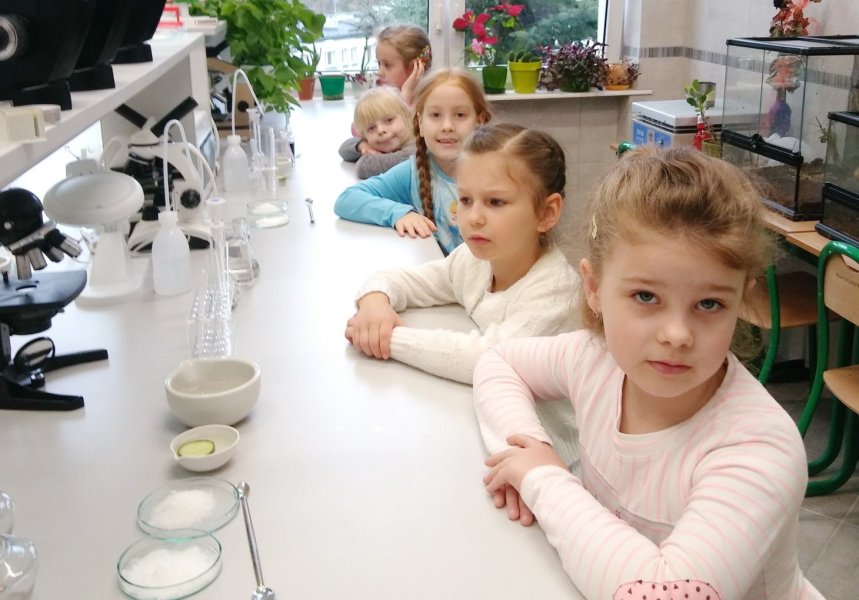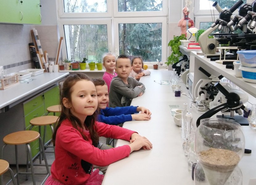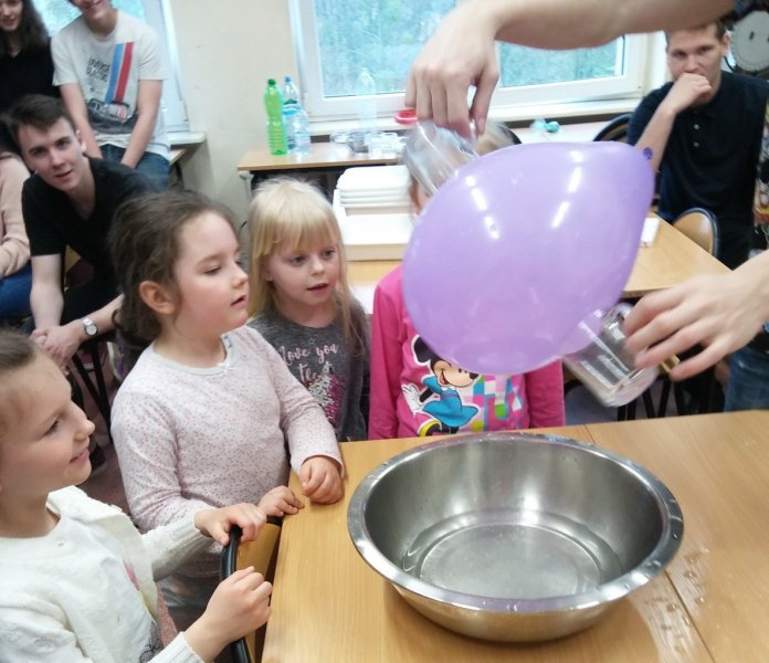 Przedszkolaki pod okiem wykwalifikowanej kadry pedagogicznej i uczniów, eksperymentowały, odkrywały, pogłębiały wiedzę w dobrze wyposażonych laboratoriach. Poznały niektóre właściwości wody i powietrza, pa rzerwę w zajęciach doświadczalnych spędziły, integrując się z młodzieżą na sali gimnastycznej podczas wspólnych zabaw.