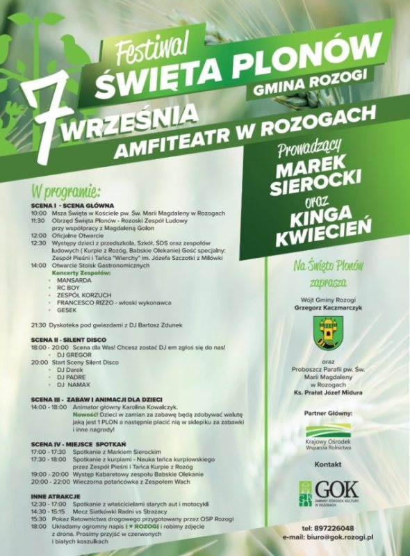 Nie Opole, nie Sopot – tym razem Rozogi. Marek Sierocki, dziennikarz muzyczny, konferansjer i twarz Teleexpressu, już 7 września poprowadzi Festiwal Święta Plonów. Po raz pierwszy gmina organizuje dożynki w formule wielkiego festiwalu – z czterema scenami, gwiazdami i atrakcjami, jakich tu jeszcze nie było.