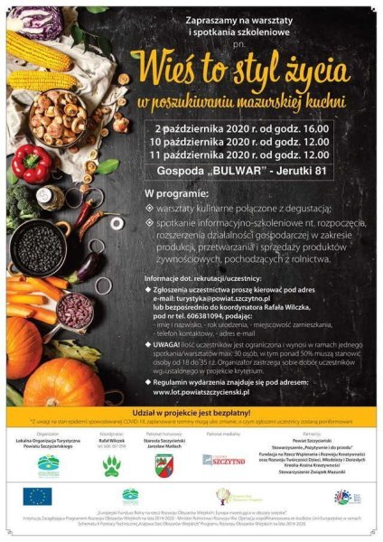 "Wieś to styl życia - w poszukiwaniu mazurskiej kuchni” - to tytuł projektu, realizowanego przez Lokalną Organizację Turystyczną Powiatu Szczycieńskiego i grono partnerów, z udziałem środków pozyskanych w PROW na lata 2014-2020. W ramach projektu, w trzech terminach (2.10 – od godz. 16.00 oraz 10 i 11.10 – od godz. 12.00), odbędą się warsztaty kulinarne połączone z degustacją oraz spotkanie informacyjno-szkoleniowe nt. rozpoczęcia, rozszerzenia działalności gospodarczej w zakresie produkcji, przetwarzania i sprzedaży produktów żywnościowych, pochodzących z rolnictwa.
