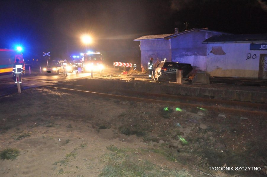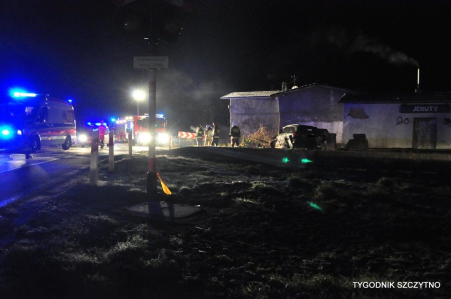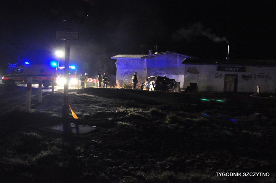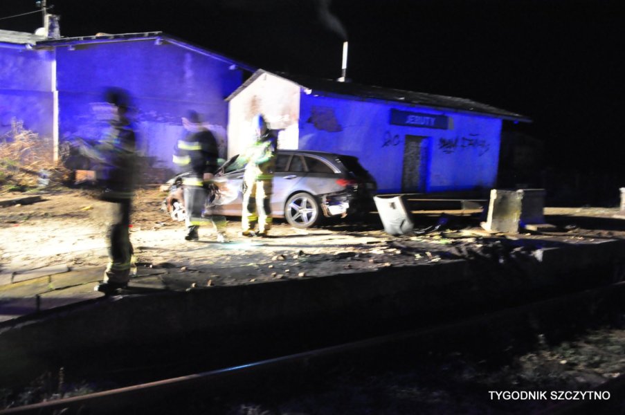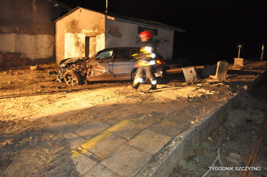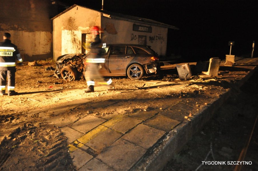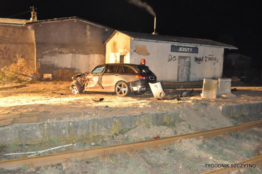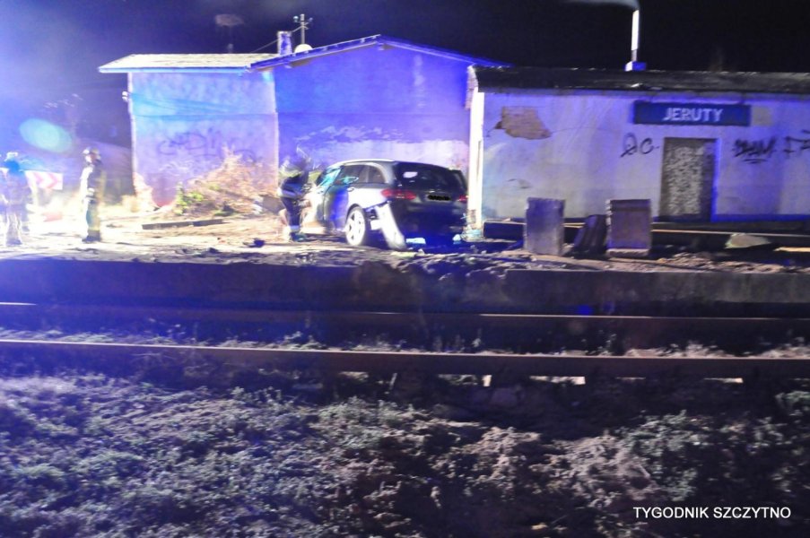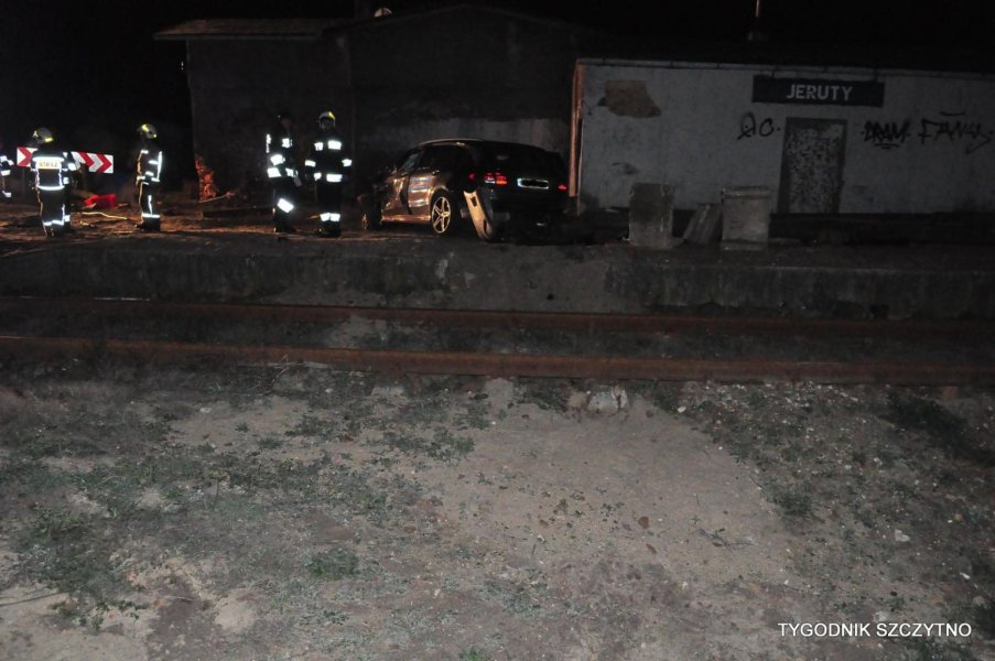 Do tego groźnego wypadku doszło dziś (poniedziałek, 26 listopada) około godziny 17. Z pierwszych ustaleń policji wynika, że kierowca jechał najprawdopodobniej zbyt szybko. Nie zdołał wyhamować auta przed przejazdem kolejowym i tak zwaną drogową „eską”. Samochód przeciął jezdnię, wyleciał z drogi, ściął słup i zatrzymał się na budynku sąsiadującym z peronem stacji PKP Jeruty.