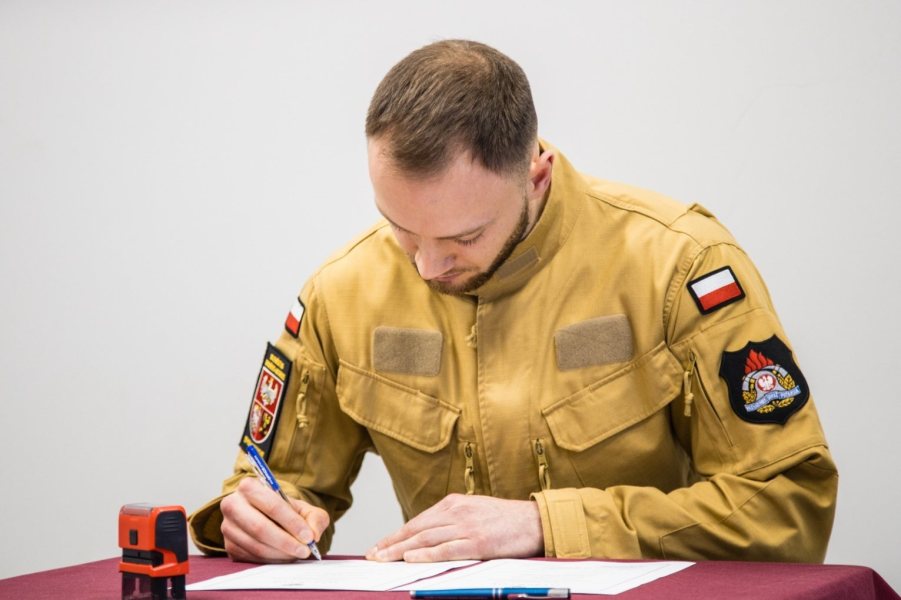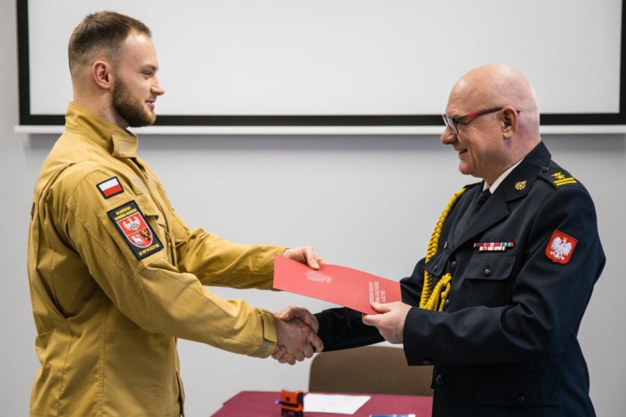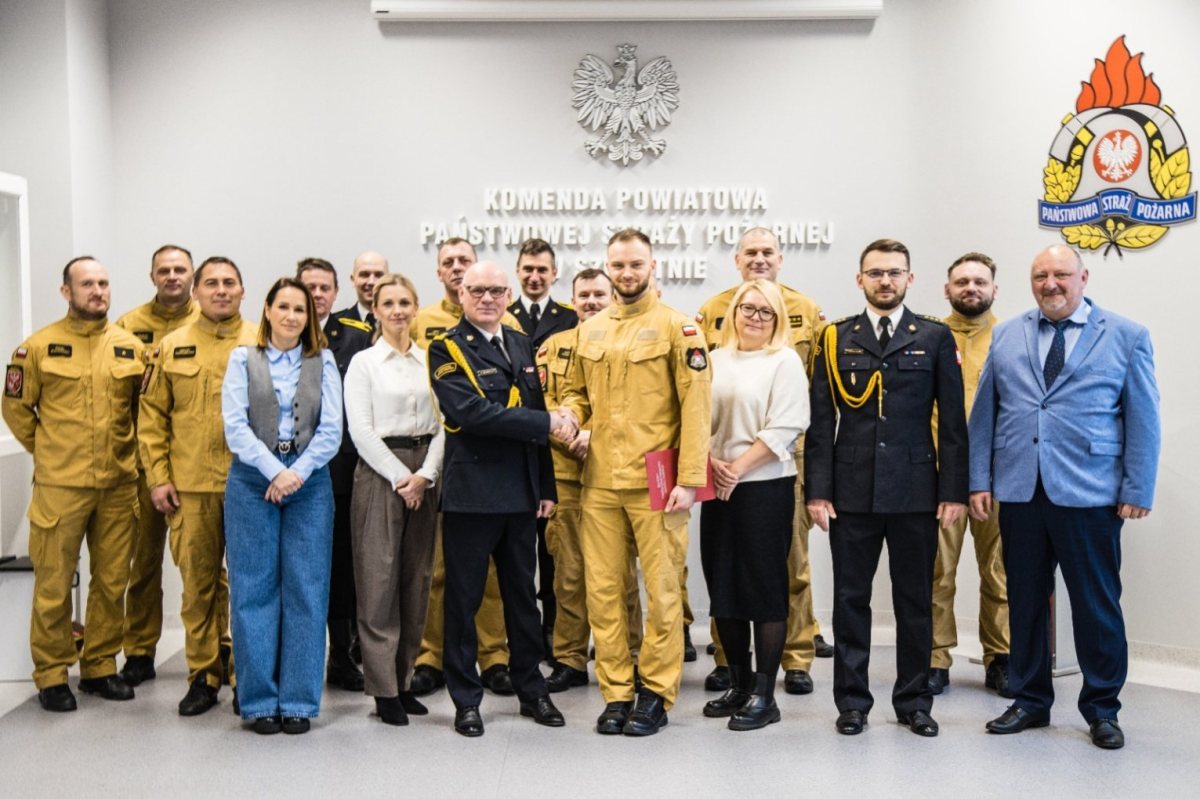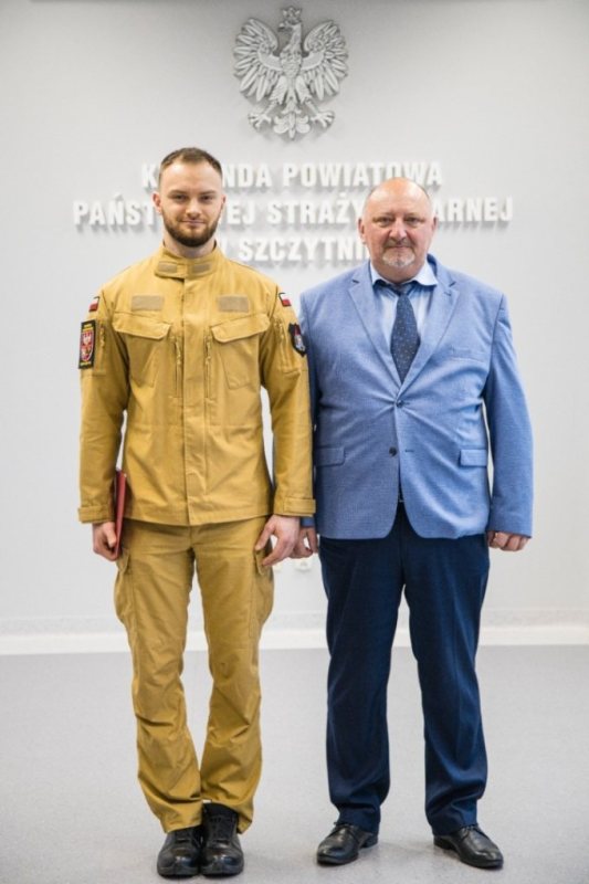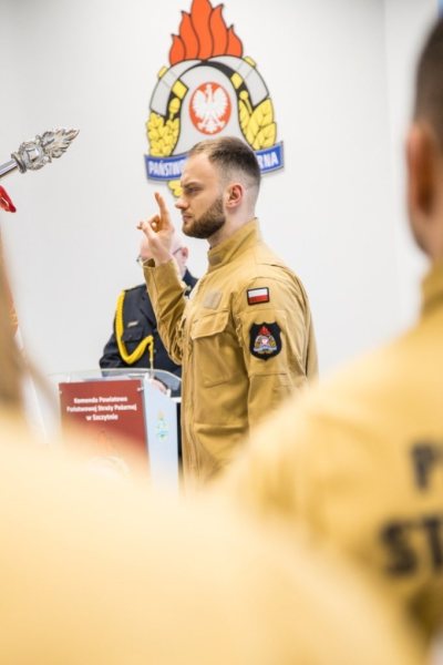 W Komendzie Powiatowej Państwowej Straży Pożarnej w Szczytnie odbyła się uroczystość ślubowania strażaka Michała Zegi, który rozpoczął służbę przygotowawczą. Moment złożenia roty był formalnym rozpoczęciem kariery w PSP oraz symbolicznym potwierdzeniem gotowości do działania na rzecz bezpieczeństwa mieszkańców. W wydarzeniu uczestniczyli przedstawiciele kierownictwa komendy oraz ojciec strażaka, który towarzyszył mu w tym ważnym dniu. Ślubowanie, zgodnie z ceremoniałem, przyjął Komendant Powiatowy PSP w Szczytnie bryg. Zbigniew Stasiłojć.