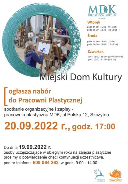 Do dnia 19 września 2022 r. osoby uczęszczające w ubiegłym roku na zajęcia plastyczne prosimy o potwierdzenie chęci kontynuacji uczestnictwa pod numerem telefonu: 609 064 262, w godzinach od 9:00 do 14:00.
