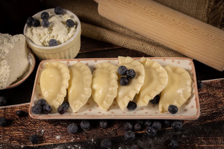 Na słodko: ser, ser z brzoskwinią, ser z borówką amerykańską, pierogi z makiem