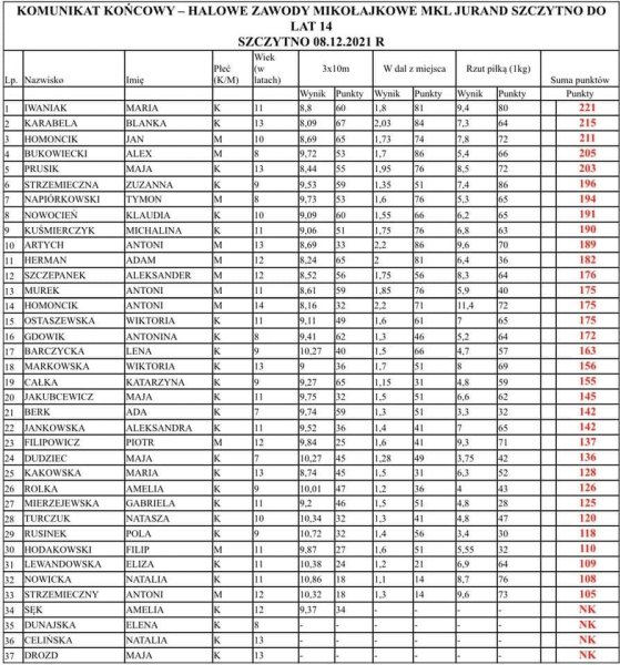 8 grudnia odbyły się skierowane dla zawodników MKL Jurand Szczytno Mikołajkowe Halowe Zawody Lekkoatletyki do lat 14. W ramach zawodów każdy zawodnik wziął udział w trójboju lekkoatletycznym składającym się z biegu 3x10m, skoku w dal z miejsca, czy rzutu jednokilogramową piką lekarską.