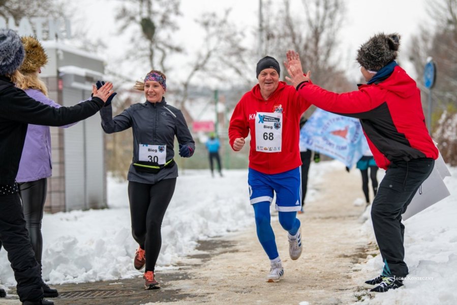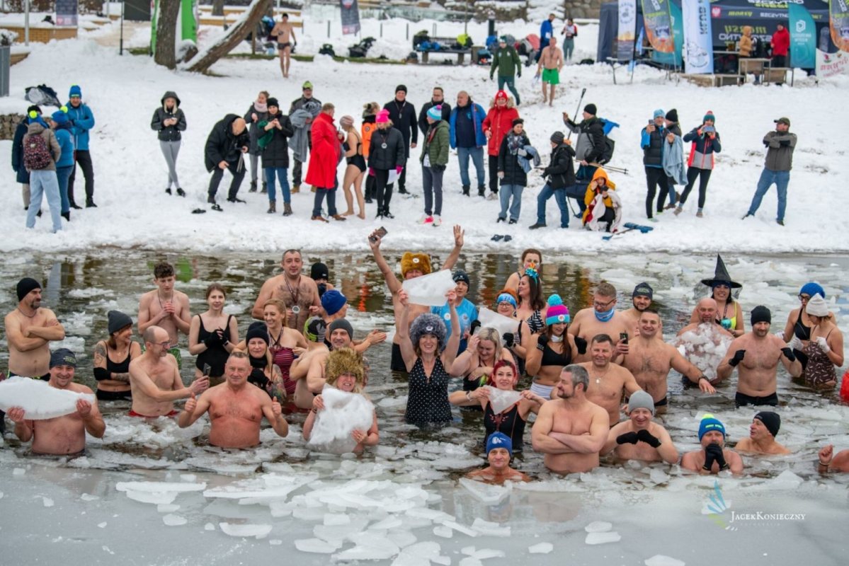 Setka uczestników ruszyła w teren zaraz po starcie. Biegacze pokonywali trasę w szybkim tempie, a atmosfera bardziej przypominała spotkanie znajomych niż poważne zawody. Obok linii mety trwało morsowanie. Do wody weszło pięćdziesięciu śmiałków. Skakali, zanurzali się i pozowali do zdjęć.