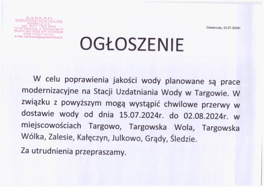 Zakład Gospodarki Komunalnej w Dźwierzutach informuje o planowanych pracach modernizacyjnych na Stacji Uzdatniania Wody w Targowie. W związku z tym, w okresie od 15 lipca do 2 sierpnia 2024 roku, mogą wystąpić chwilowe przerwy w dostawie wody.