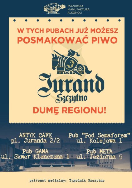 Legenda powróciła – od dziś można spróbować piwa Jurand. Na razie pojawi się ono jedynie w czterech pubach na ternie Szczytna: Pub "Pod Semaforem" (ul. Kolejowa 1), Pub META (Ul. Jeziorna 9) oraz ANTYK CAFE ( Plac Juranda 2/2) i Pub GAMA (Ul. Skwer Klenczona 1).